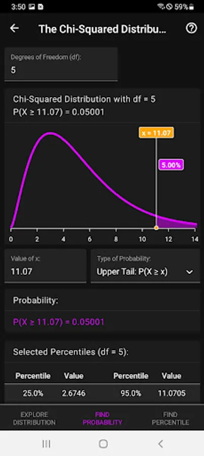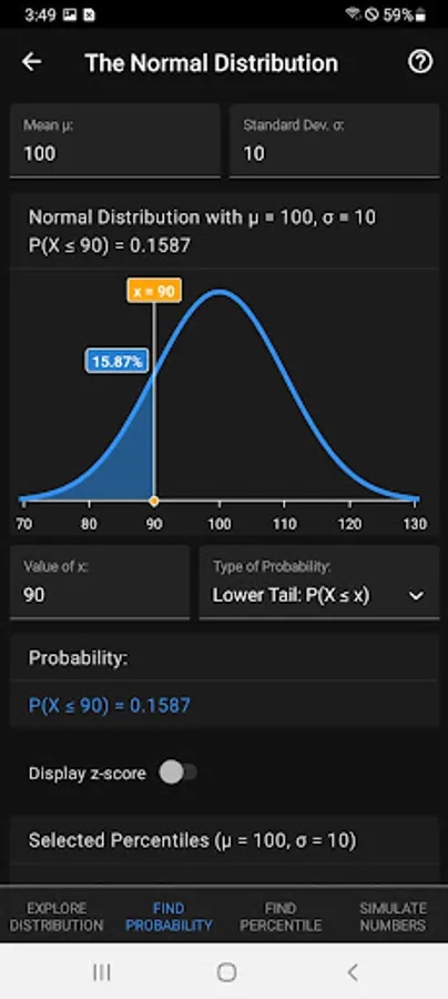 Explore and visualize probability distributions via sliders and buttons. Find probabilities or percentiles (two-tailed, upper tail or lower tail) for computing P-values or when working with discrete distributions. Find critical values for confidence intervals. Display the expected value and standard deviation, and simulate random numbers from many continuous and discrete distributions.