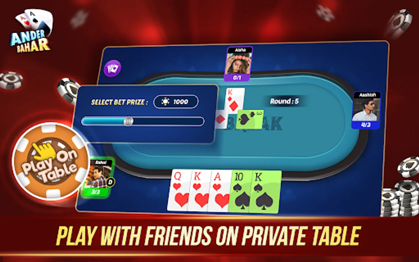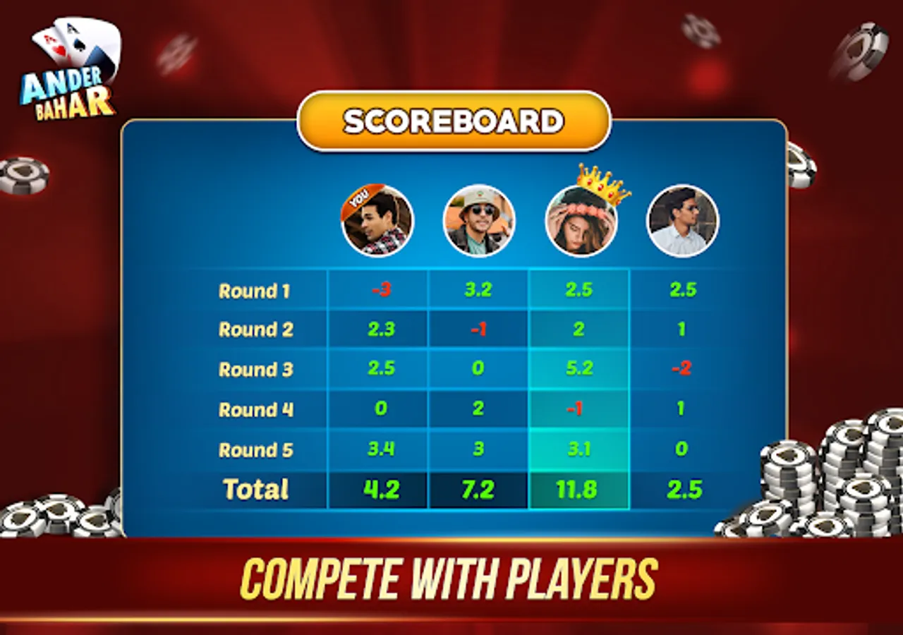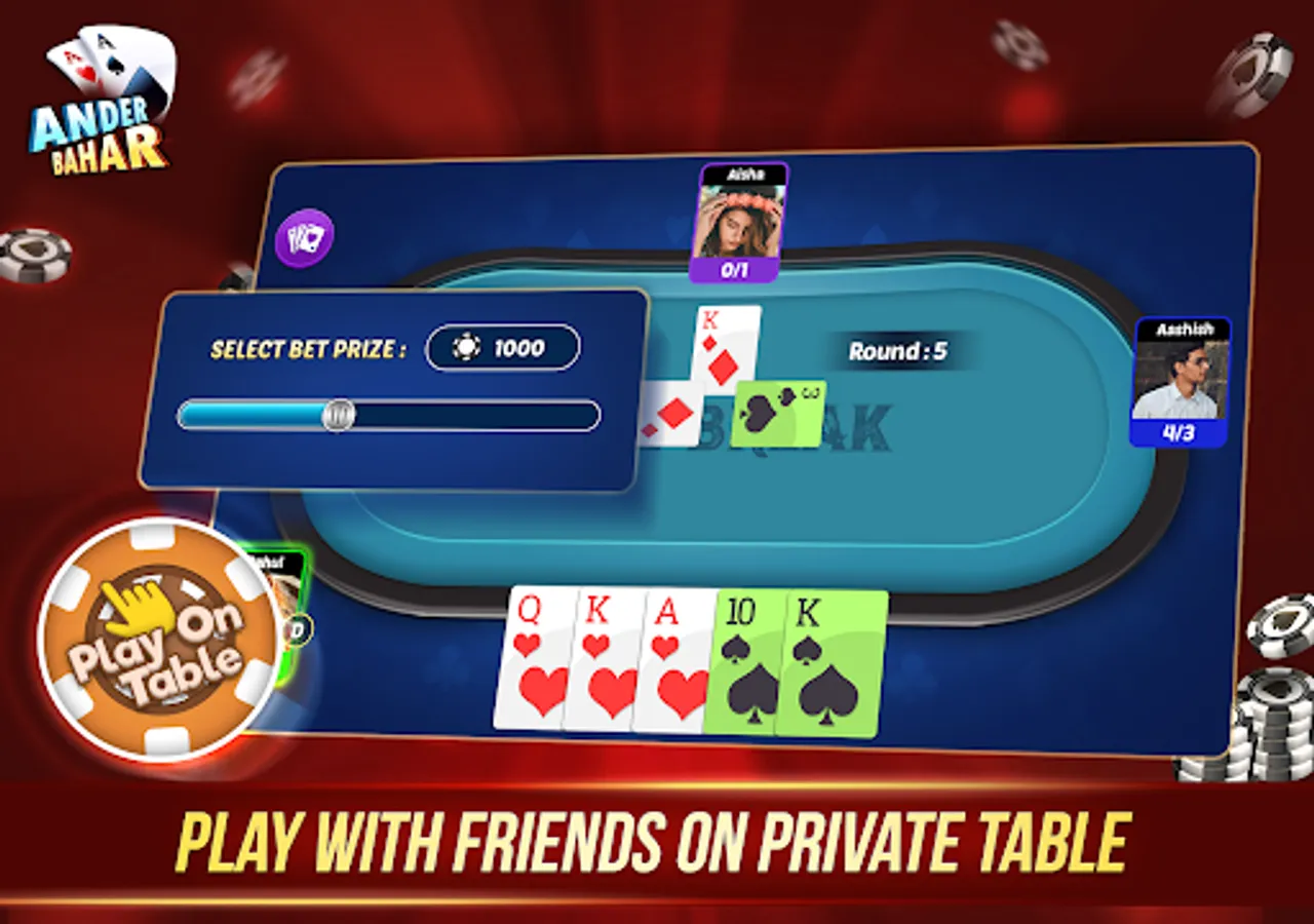 The Andar Bahar Card Game is only for entertainment purposes where you can play and win the chips in the game. Andar Bahar Game is known as the tash game and is a betting card game of the UK gambling style. The Andar Bahar App does not support any "real money gambling game" or an opportunity to win real money prizes. Andar Bahar Game also has the facility to play other games like Call Break Card Game.