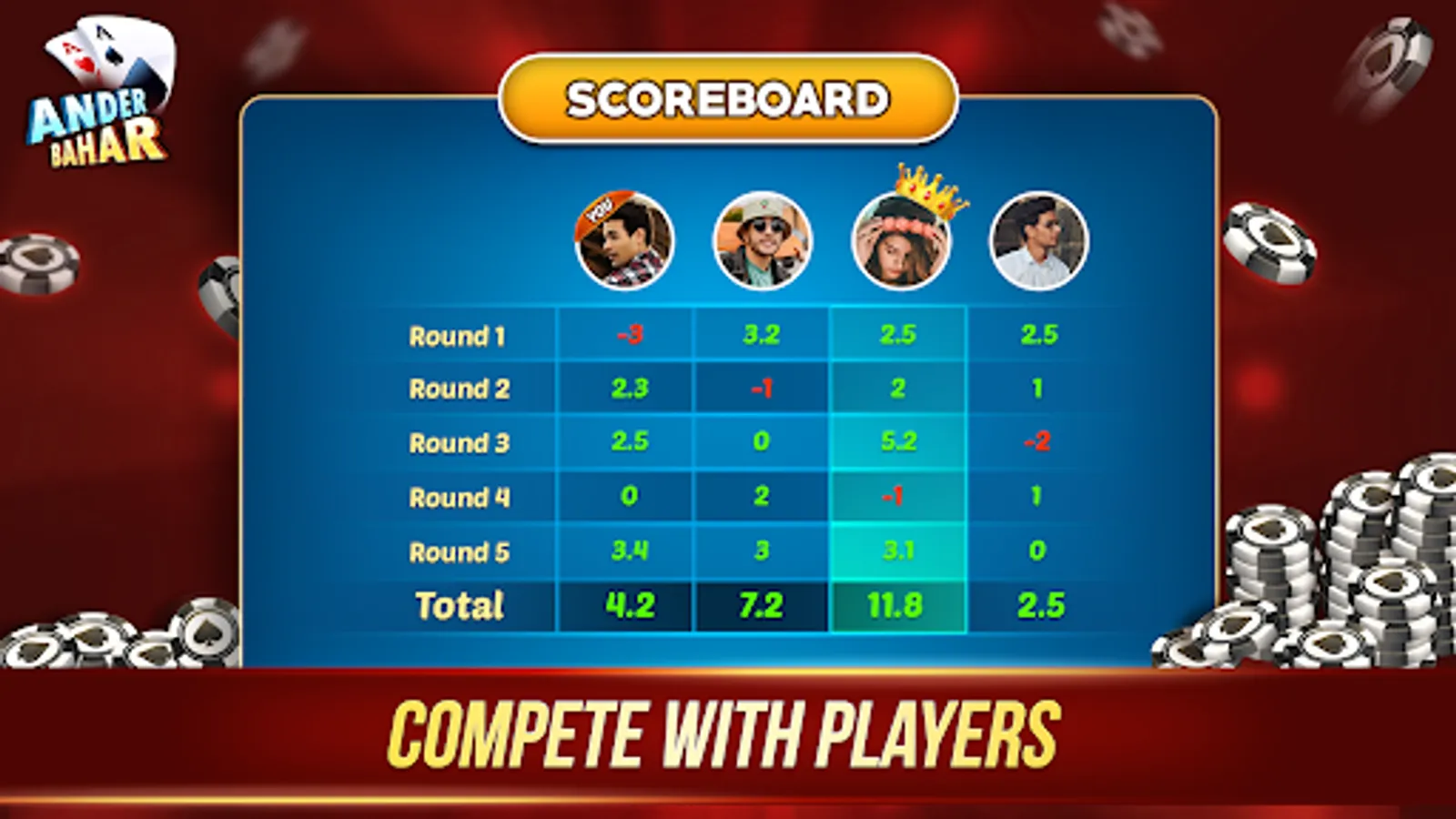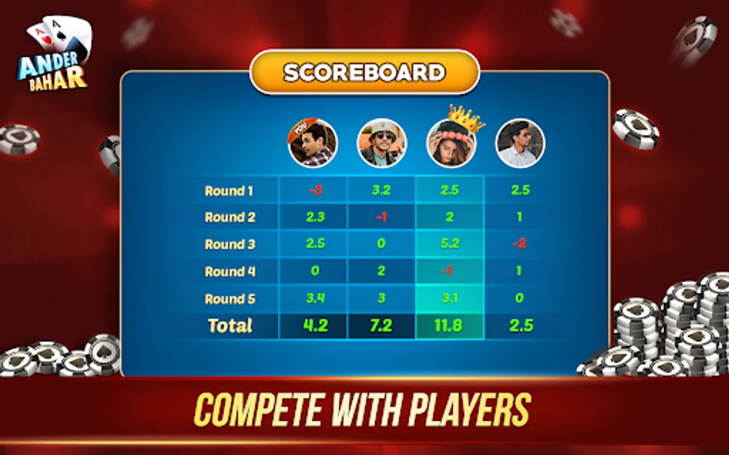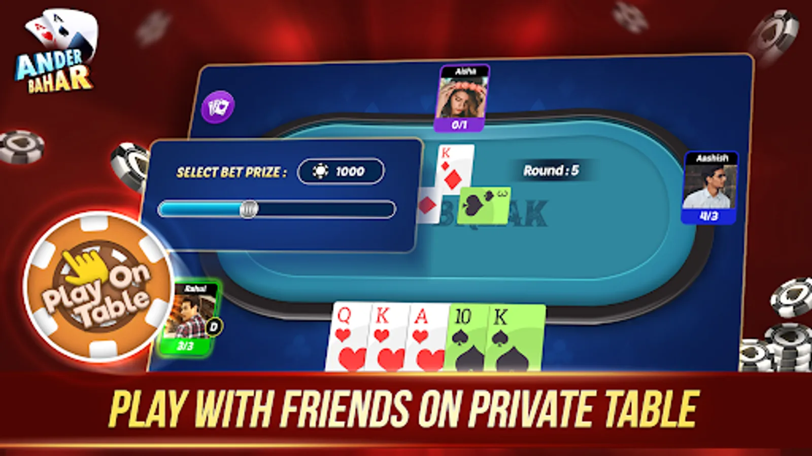 The Andar Bahar Card Game is only for entertainment purposes where you can play and win the chips in the game. Andar Bahar Game is known as the tash game and is a betting card game of the UK gambling style. The Andar Bahar App does not support any "real money gambling game" or an opportunity to win real money prizes. Andar Bahar Game also has the facility to play other games like Call Break Card Game.