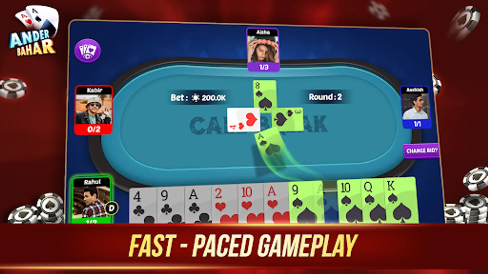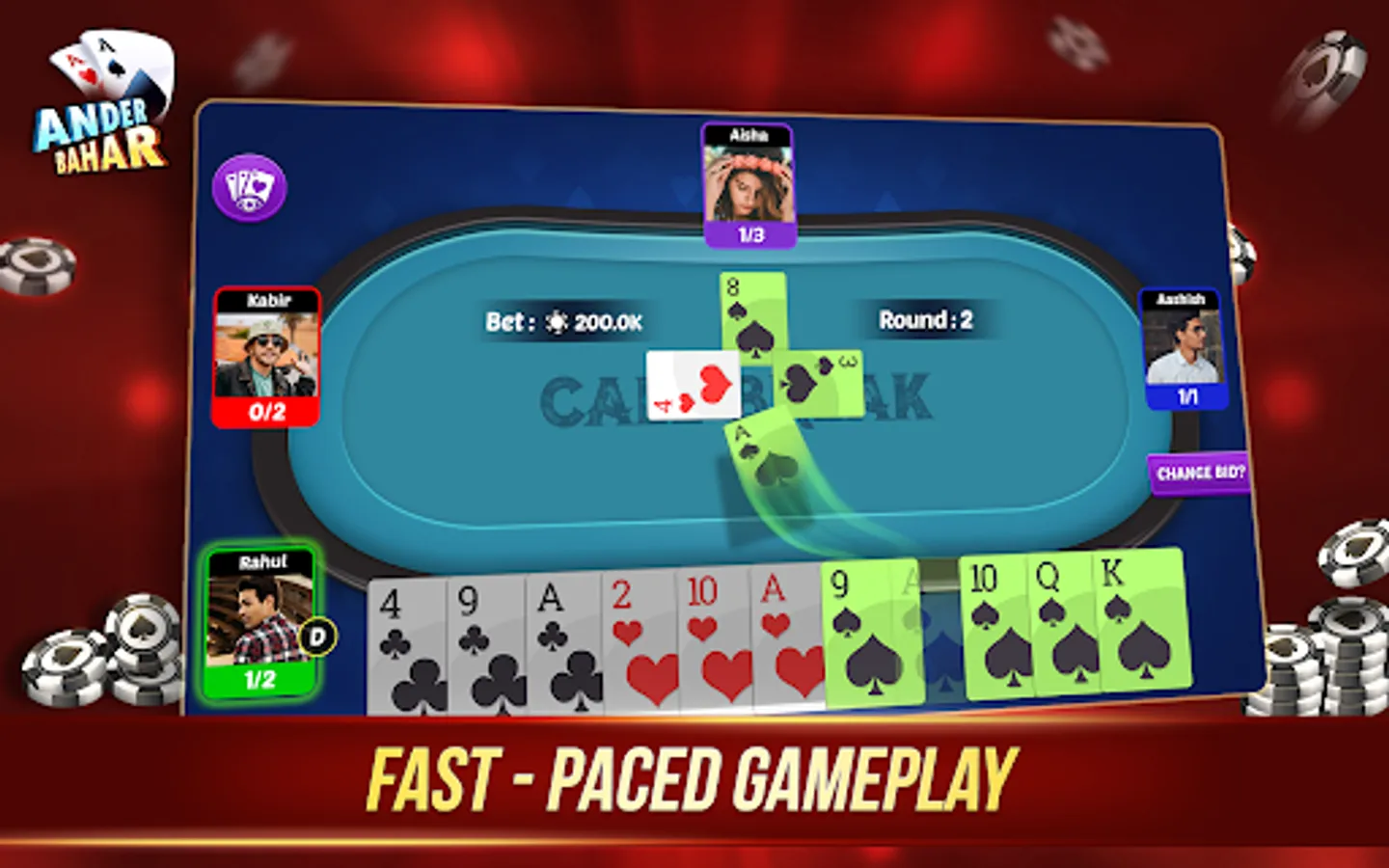 There is no end to playing card games. Play again and again and improve your card-playing skill with Andar Bahar - Call break card Game.