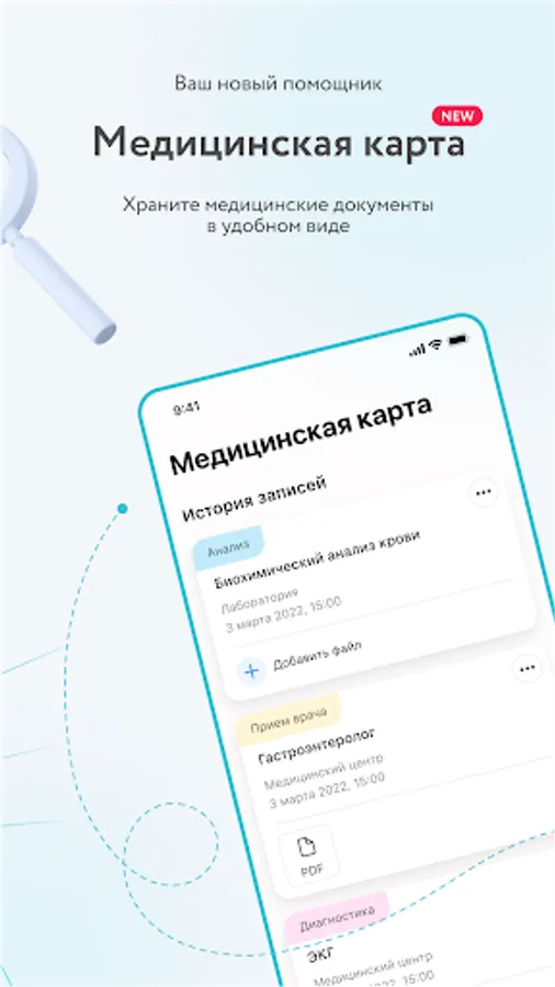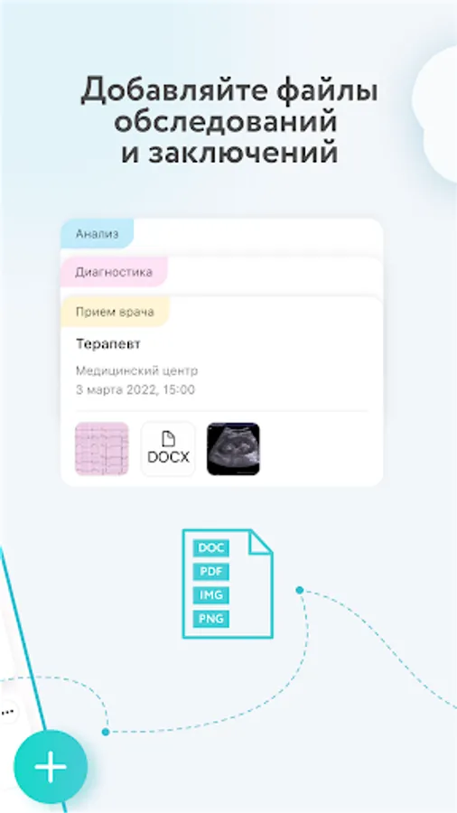 Convenient storage of examination results, doctor's reports and other medical documents. All your medical history will be kept in an organized format and always at hand.