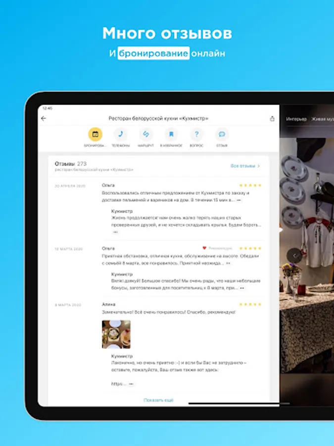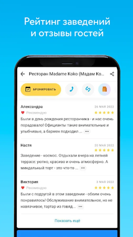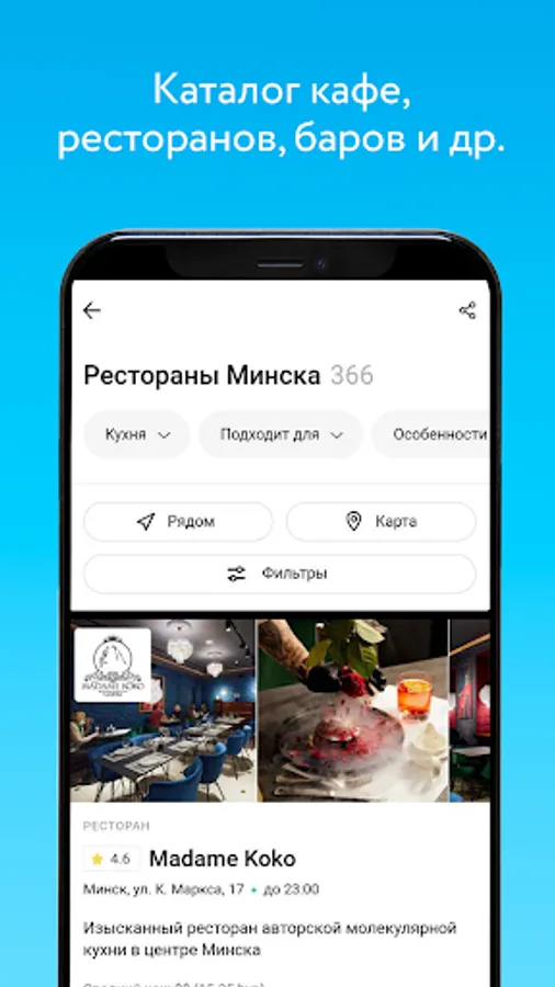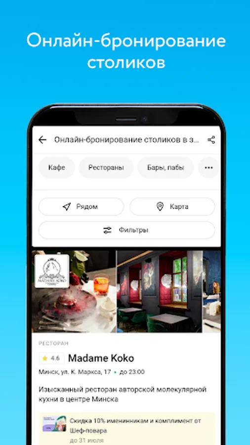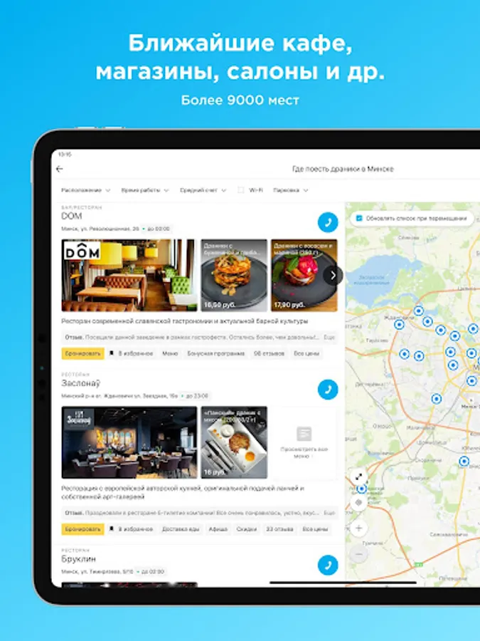 • Booking establishments in Minsk directly in the application.