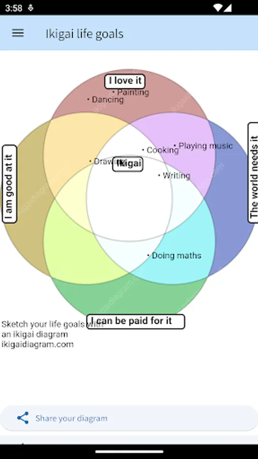 Find your passion, your vocation or what could be your career by drawing your ikigai diagram.
