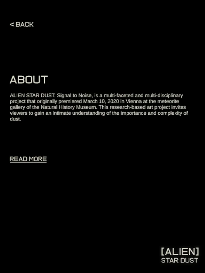 This app is part of the [Alien] Star Dust traveling exhibition, and is meant to be used in order to experience the installation. The app allows visitors to view 3D representations of historically significant meteorites with accompanying binaural sound.