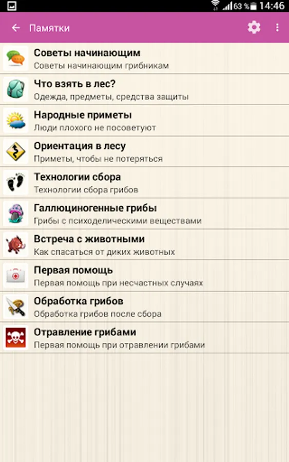 12. 11 helpful reminders: "Tips for beginners", "What to take to the woods," "Folk omens", "Orientation in the forest", "collection Technology", "Hallucinogenic Mushrooms", "Meet the animals", "First Aid" "Rules of conduct for weapons detection," "mushroom treatment", "Poison mushrooms."