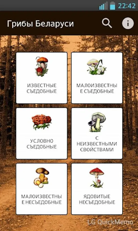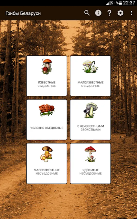 The first three sections of this fungus, suitable for human consumption, the latter - mushrooms, unfit for human consumption. The list of names and fungi fully comply with the scientific classification. In total, the program describes the characteristics and growing conditions 207 most famous mushroom. Each mushroom has a color photo in high resolution (some 2 or more). For photos in full-screen viewing mode available scaling. For similar species provides the function of "Twins" (the button in the upper left corner of the photo).