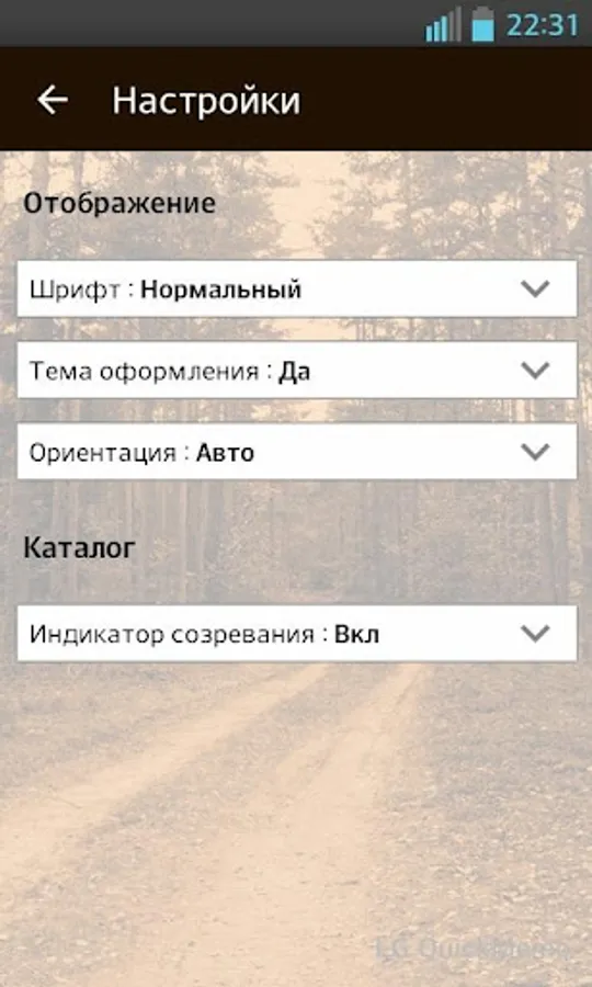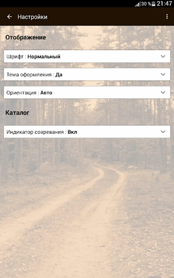 The program has a service menu through which you can one-click access to the main menu, call the dialog "Search" to find mushrooms growing now (option "Time to gather"), edit the display settings via the "Settings" (font, design theme, including the maturation of the indicator ), to learn more about the program, read the information.