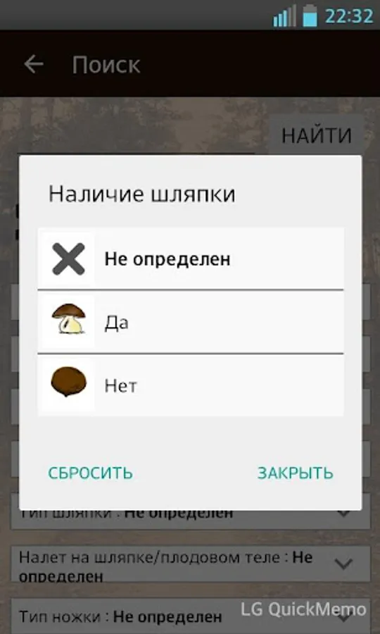 The search is performed on all six sections of the program by name and description of the fungus. You can also use advanced filtering (the determinant of the fungi for 16 parameters). Stores results.