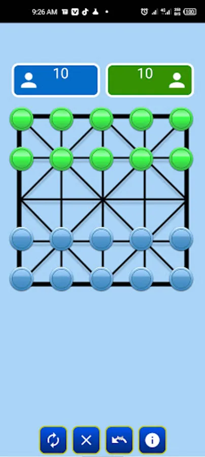 The board consists of a grid with twenty-five intersections or points. Each player moves one of their pieces per turn. A piece may move to any vacant point on the board, not just an adjacent one.