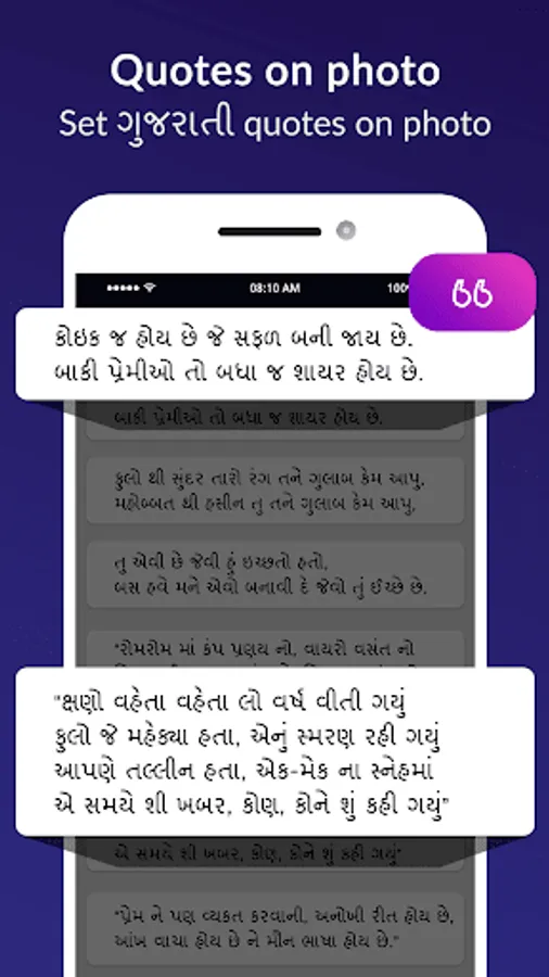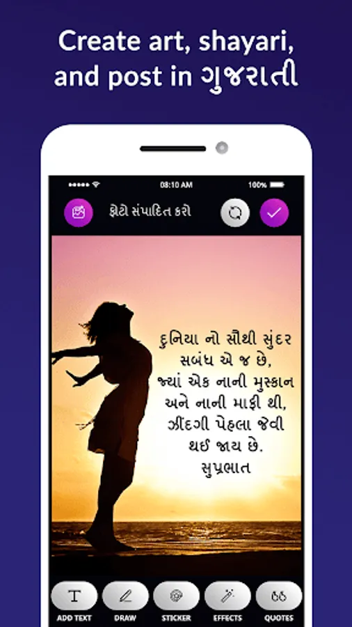 In Gujarati typing on photo app you can create DP, status, post and wallpaper with gujarati language. write name, shayari, gazal, quotes on photo and send it to your friends, special one and family member.