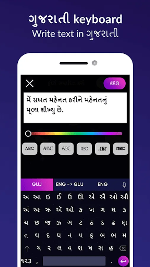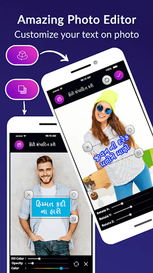 - Edit text with different gujarati font, font color, bg color, text border, 3D rotate, alignment and spacing option.