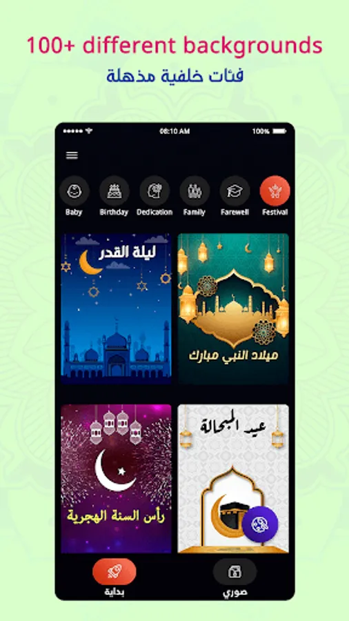 Arab Photo Designer app is helps to send festival wishes to your friend and family member and celebrate festival like Islamic New Year, Ashura, Muharram, Ramdan, Eid-e-Shuja', Arba'een, Mawlid an-Nabī, Birthday of ‘Alī ibn Abī Ṭālib, Laylat al-Mi'raj, Laylat al-Bara'at, Laylat al-Qadr, Chaand Raat, Eid al-Fitr, Day of Arafah, Eid al-Adha etc.