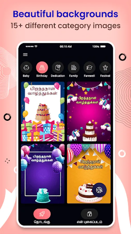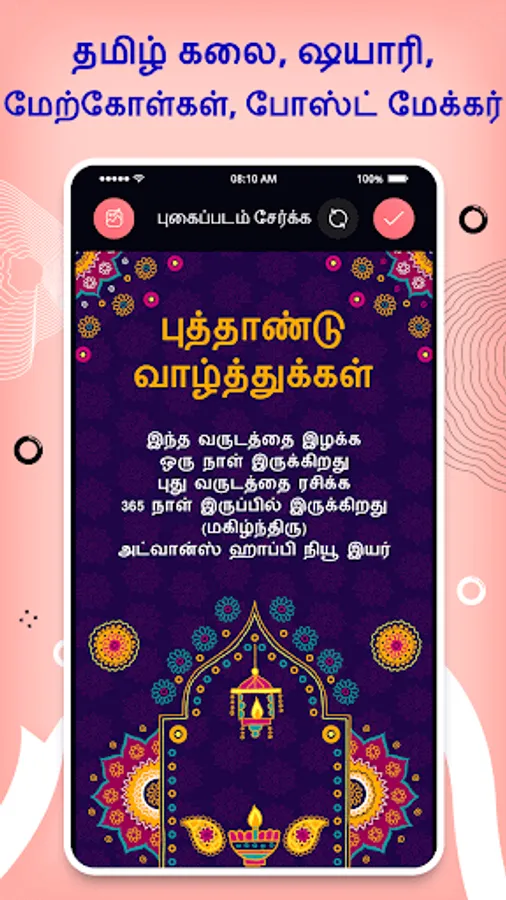 This tamil poster maker app is helps to send festival wishes to tamil people or your friend and family member and celebrate festival like Diwali, New Year, Pongal, Thiruvaiyaru Festival, Thaipusam, Natyanjali Dance Festival, Mahamaham, Tamil New Year's Day, Karthigai Deepam, Dussehra, Holi, Dhuleti, Janmashthami, Navratri, Raksha Bandhan, Ram Navami, Christmas, Pateti, Independant Day, Republic Day, Muharram, Ramadan Eid, Makar sankranti etc.