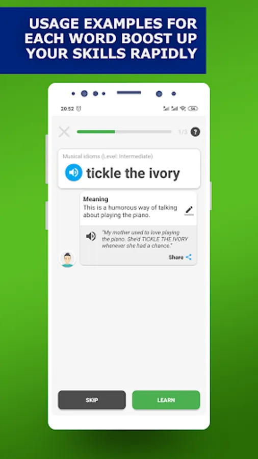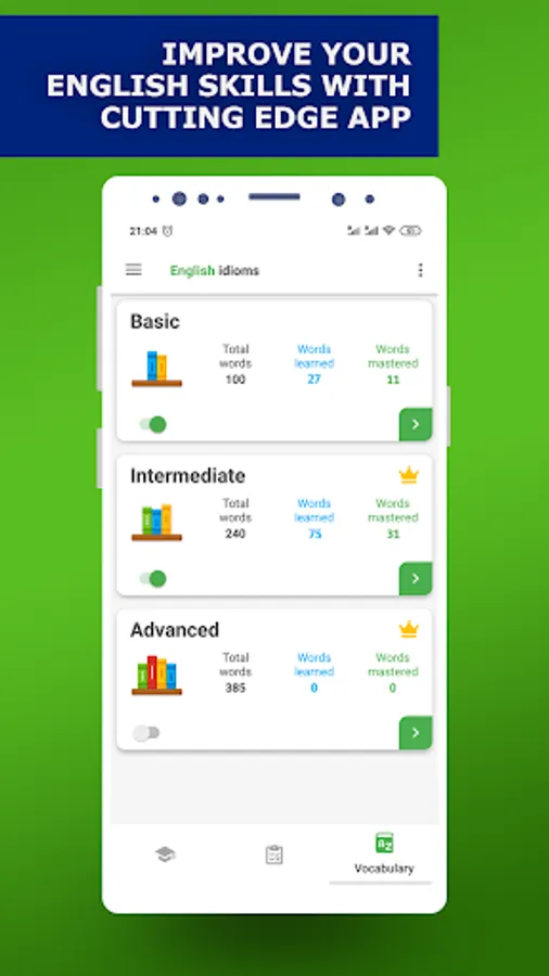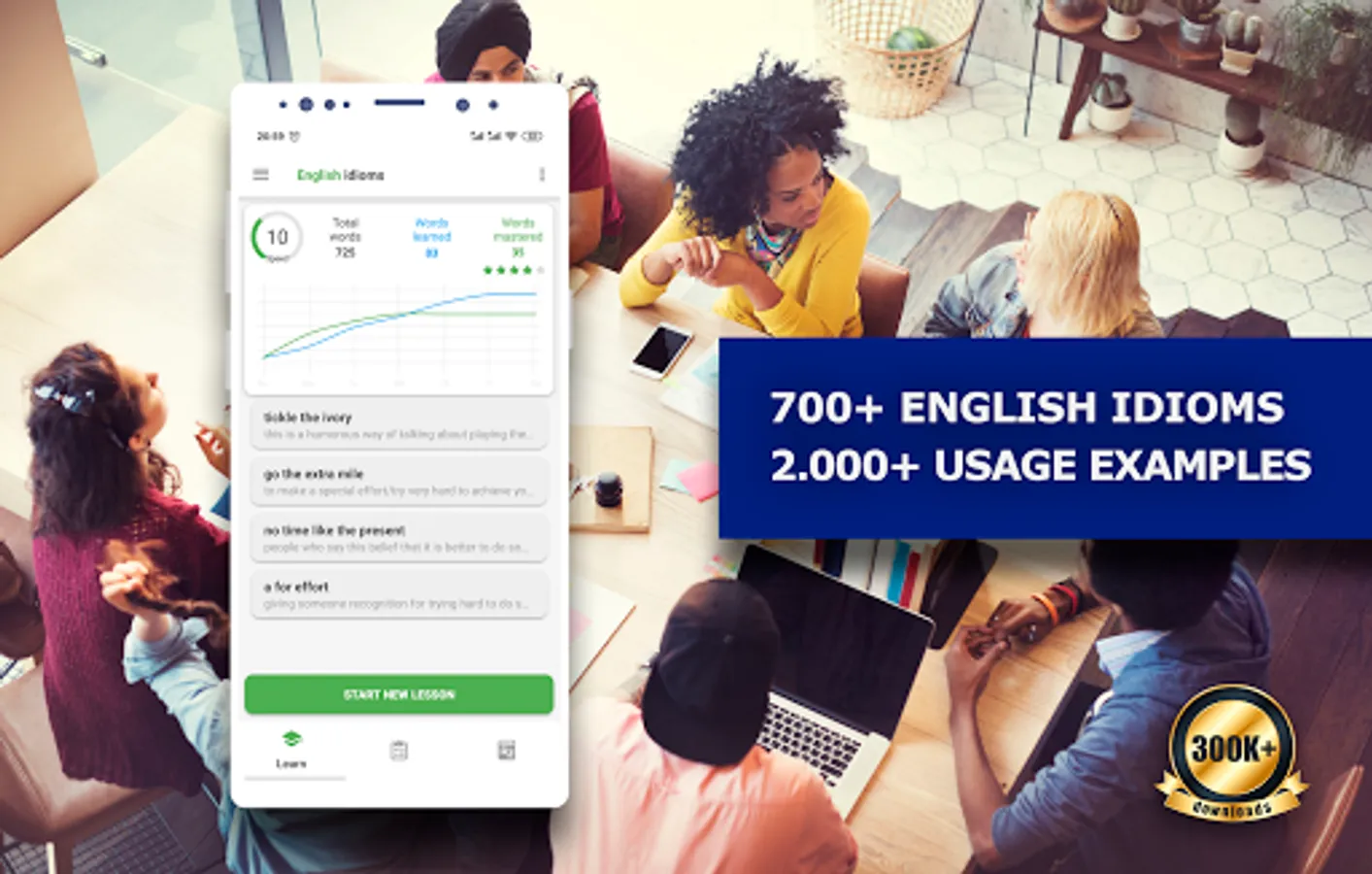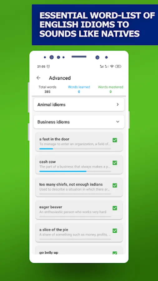 There are many idioms in English. Since they cannot been translated verbatim, you just have to clarify its meanings and memorize them. In our words booster app we have collected more than 700 the most usable idioms and slang phrases for mastering and made user-friendly interface, which helps to make language learning process quit simple and fast.