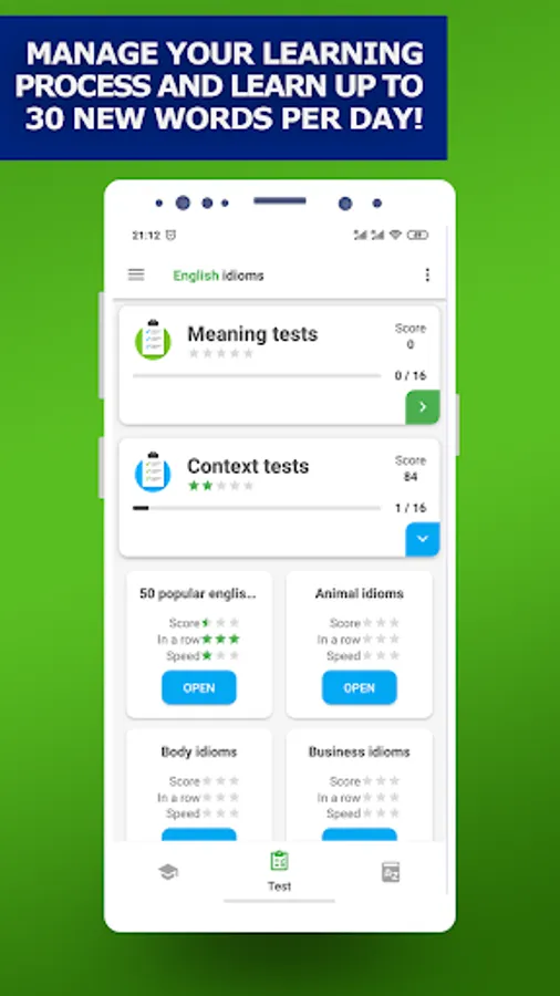 We have added big set of tests with various difficulty levels into this vocabulary builder so you can initially learn English words, idioms and slang phrases and then test your new knowledge.