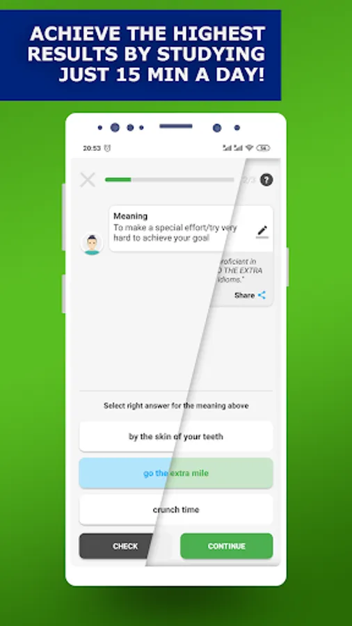 There are many exercises for memorizing new words. There are flashcards with idiom or slang phrase in the first part of the lesson. You can listen to correct pronunciation, take a look at the definitions and usage examples. If you already know this idiom, you can skip it and proceed with the next one. After that, you should pass a test to consolidate already learned words to define your weakest points. In the third part of the lesson, you need to complete the sentence, which contains learned idiom, using words in the right order. You can also choose a goal for the day and track your progress with a convenient interface. To get you the highest results and do not let you forget about the repeating, we have added notifications.