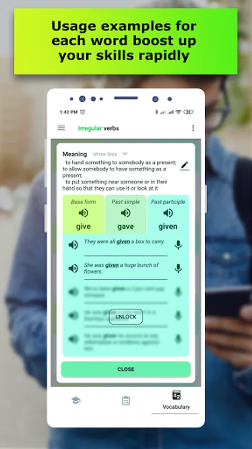 Dictionary flashcards for every irregular verb comes with set of verb tenses, full definition in English, multilingual translations, up to five examples of usage, phonetics and pronounced with different English accents so you can immediately perceive the speech by ear. Because of unique learning technique, you will keep in mind the correct spelling of the word forever.