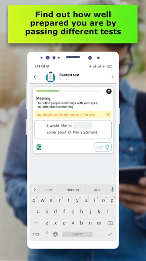 There are many exercises in the app for memorizing new words. There are flashcards with verb tenses in the first part of the lesson. You can listen to the correct pronunciation, take a look at the definition, translation and up to five examples of usage. If you already know this irregular verb, you can skip it and proceed with the next one. After that, you should pass a test to consolidate already learned irregular verbs to define your weakest points. In the third part of the lesson, you need to write down all forms of the verb using appeared keyboard. In practice activity, you should fill the gap in sentence using correct form of the required irregular verb. You can also choose a goal for the day and track your progress with a convenient interface. To get you the highest results and do not let you to forget about the repeating, we have added notifications.