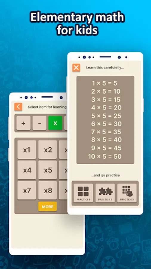 This mode contains math games for kids to help them learn the βοΈmultiplication table from 1 to 20, and then practice it by solving math puzzles. You can also learn β Addition, β Subtraction or β Division.