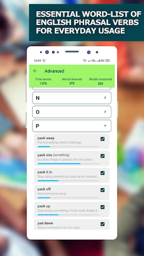 English is the most widely spoken as a second language. You can use it in formal situations like business, education, traveling, shopping as well as in informal ones like communication with company of friends etc. This vocabulary builder helps you learn and practice essential word list of phrasal verbs for using them in different conversations in English language like native speakers do.