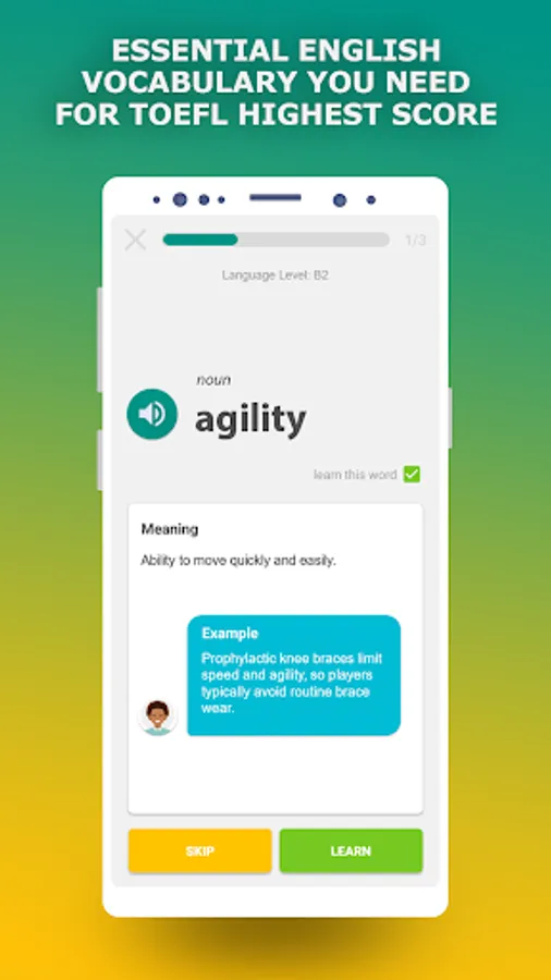 The learning technique, applied in this vocabulary builder app, allows you to learn new words quickly (up to 3000 per month), which are often use in the TOEFL exams. It will give huge support for all of listening exercises, reading practice, writing and speaking modules.