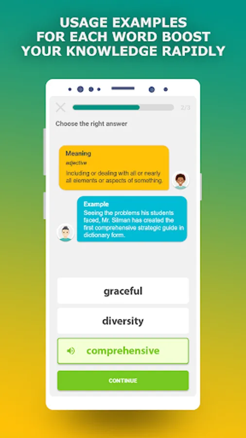 Each English word in this TOEFL vocabulary builder app is pronounced by native American English speakers so you can immediately perceive the speech by ear, which is very important for the TOEFL Listening module. Because of unique learning technique you will keep in mind the correct spelling of English words forever, which will also increase your band in the TOEFL Writing module.