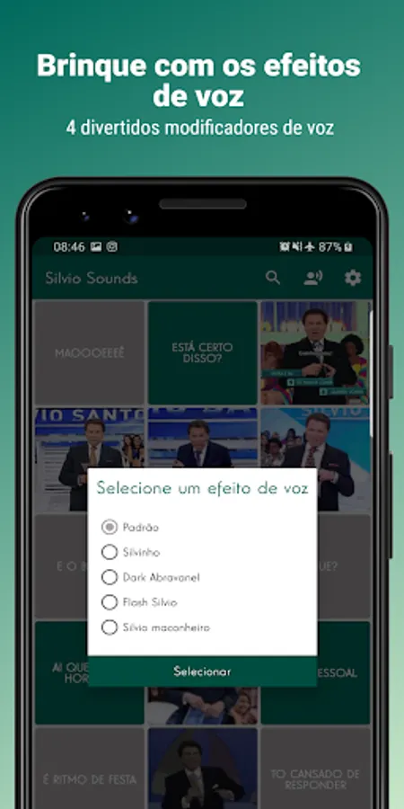 Listen and share audio Silvio Santos with your friends. You can share audio and GIFs of the largest Brazilian TV presenter by Whatsapp, Facebook and other social networks. Includes classics like "Maooe", "Are you sure?", "And the bamboo?" "Show the million", "$ 1 million" and many others.
