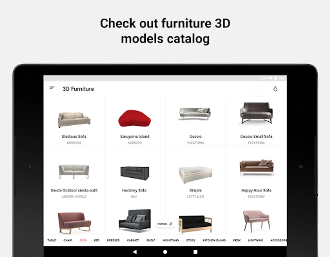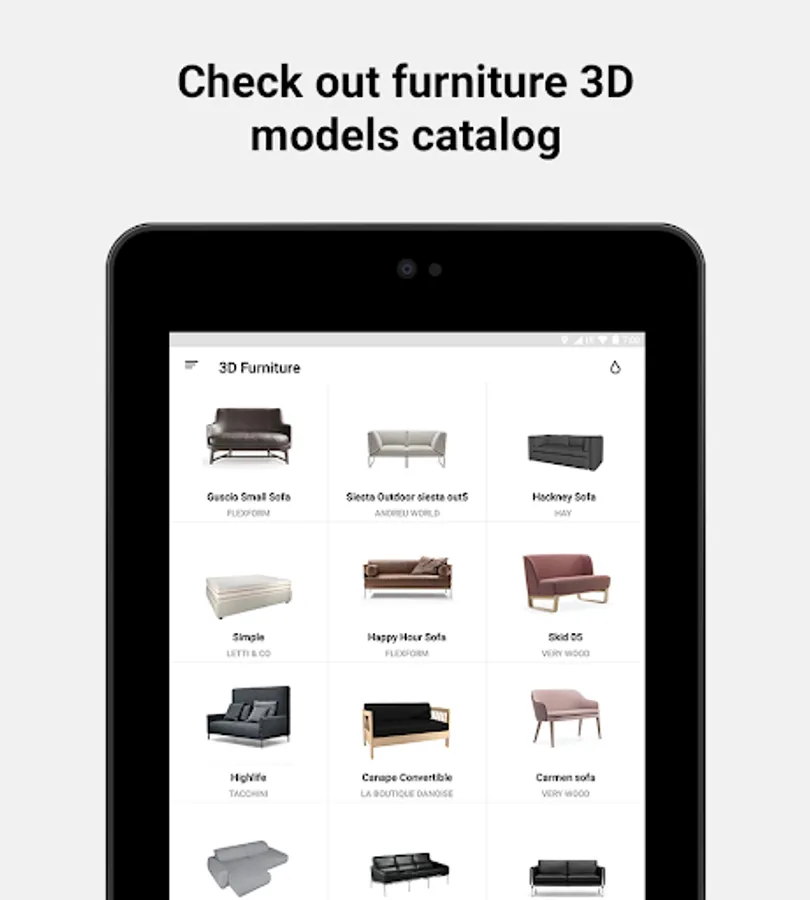 3D FURNITURE is reserved for 3D furniture catalogue where you can search for the best furniture products and test them in your home in only few clicks.