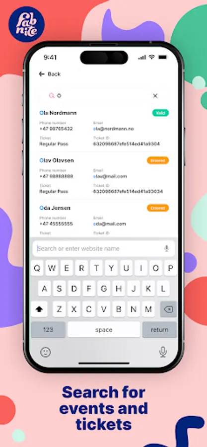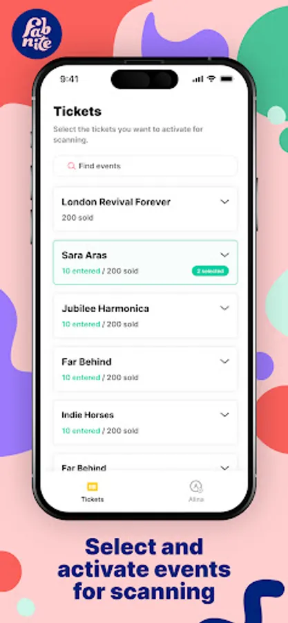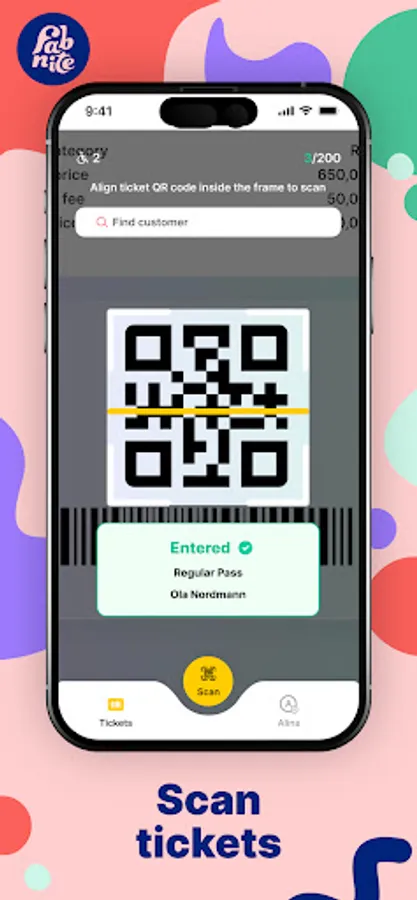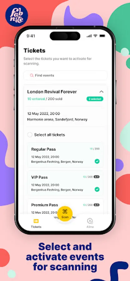 Fabnite Entry is an application specially designed for organizers of concerts, festivals and events using Fabnite. The main function is to help you keep control of the crowd flow. It efficiently scans the audience both in and out-. At the same time the system has full control at all times of how many audience members are at the event and how many tickets have been sold in different ticket categories.