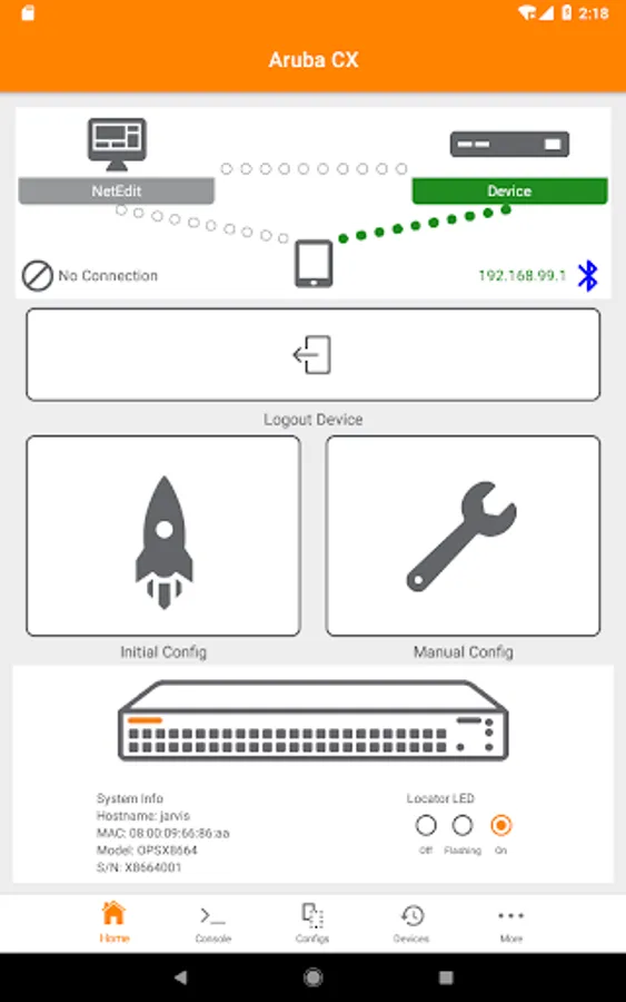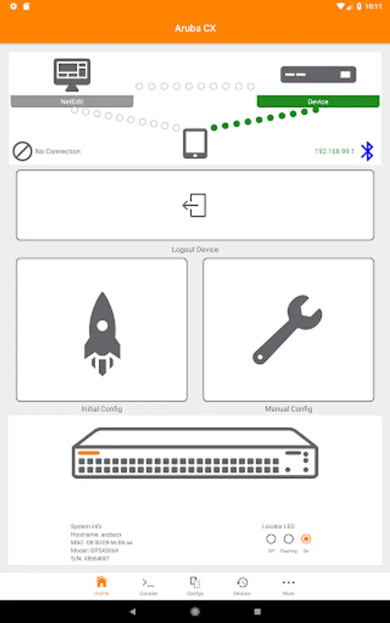 The Aruba CX mobile app automates connecting an ArubaOS-CX switch to the network. Use this mobile app to deploy and manage ArubaOS-CX switches from your mobile device. You can connect to the switch through Bluetooth or WiFi.