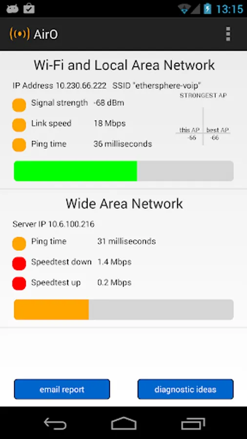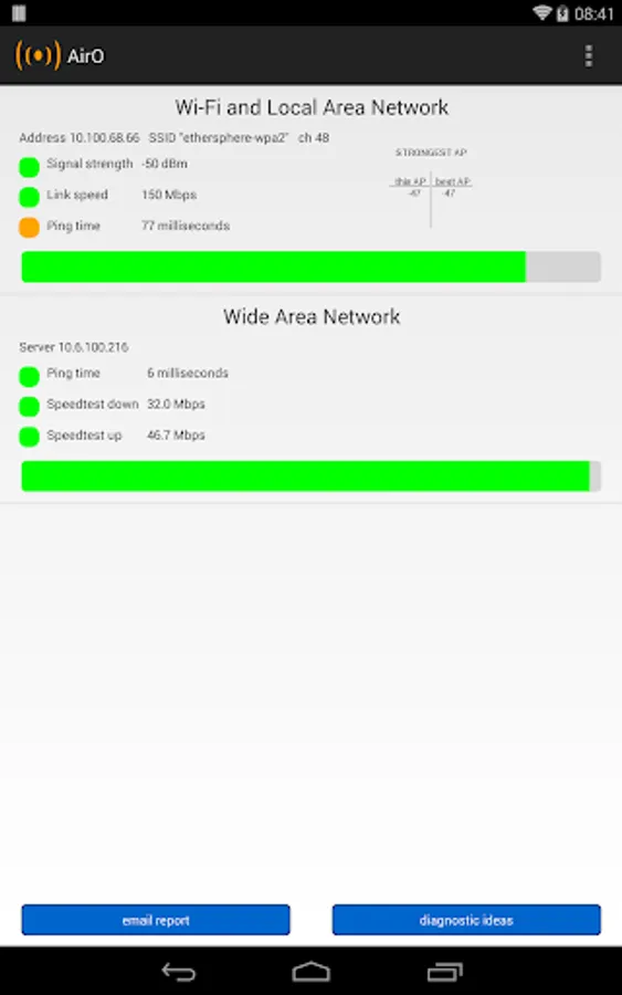 AirO is intended for technical and not-too-technical owners of Wi-Fi capable Android devices. It displays the health of the Wi-Fi (“Local Area”) connection, and measures the characteristics of a “Wide Area” connection to a server deeper in the network. It can be used to answer questions like: