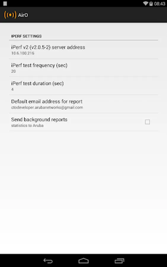 For an admin guide, including instructions on setting up your Aruba network so mDNS (AirGroup) automatically configures target addresses for AirWave and iPerf servers (allowing the app as downloaded to work on different networks without user interverntion) see the Air Observer Admin Guide hosted on the HPE Aruba Networking Airheads Community web page http://community.arubanetworks.com/t5/Aruba-Apps/New-Admin-Guide-for-the-AirO-Air-Observer-app/td-p/229749 (or go to community.arubanetworks.com and search for "AirO").
