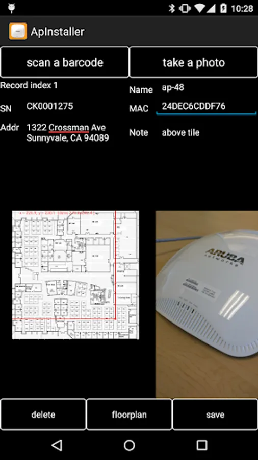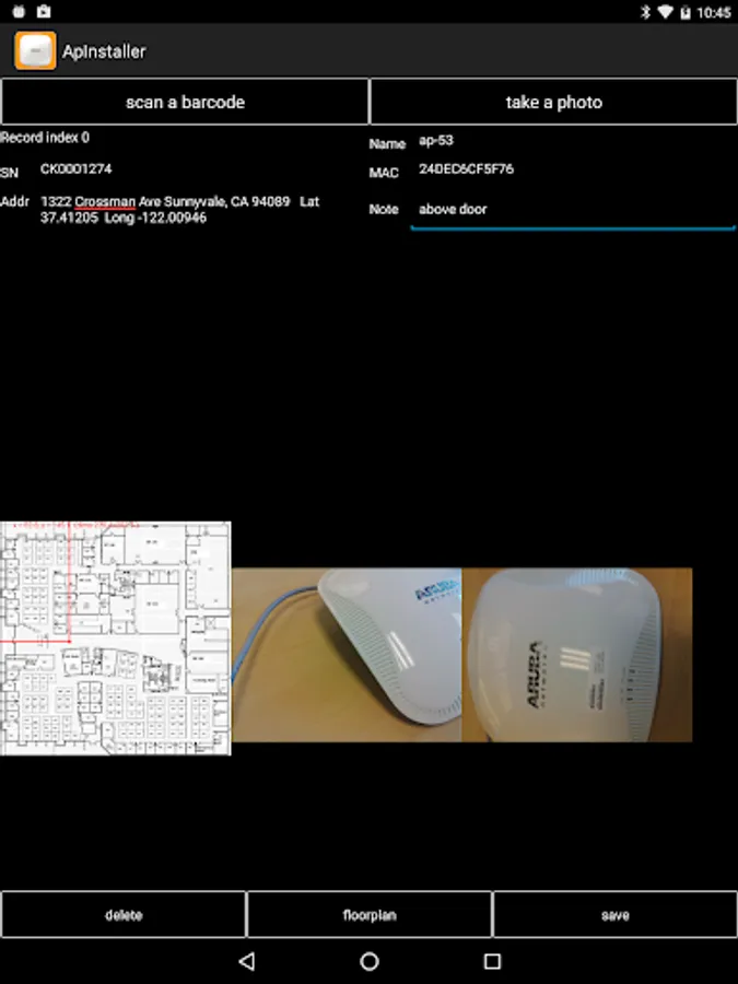 - Text entry fields for AP name, serial number, MAC, location or notes about the installation