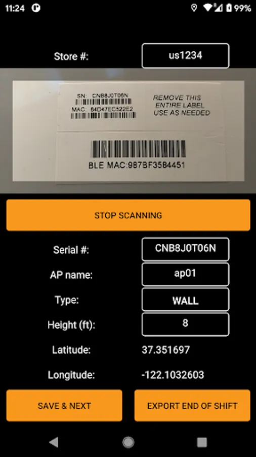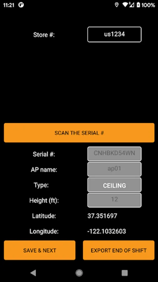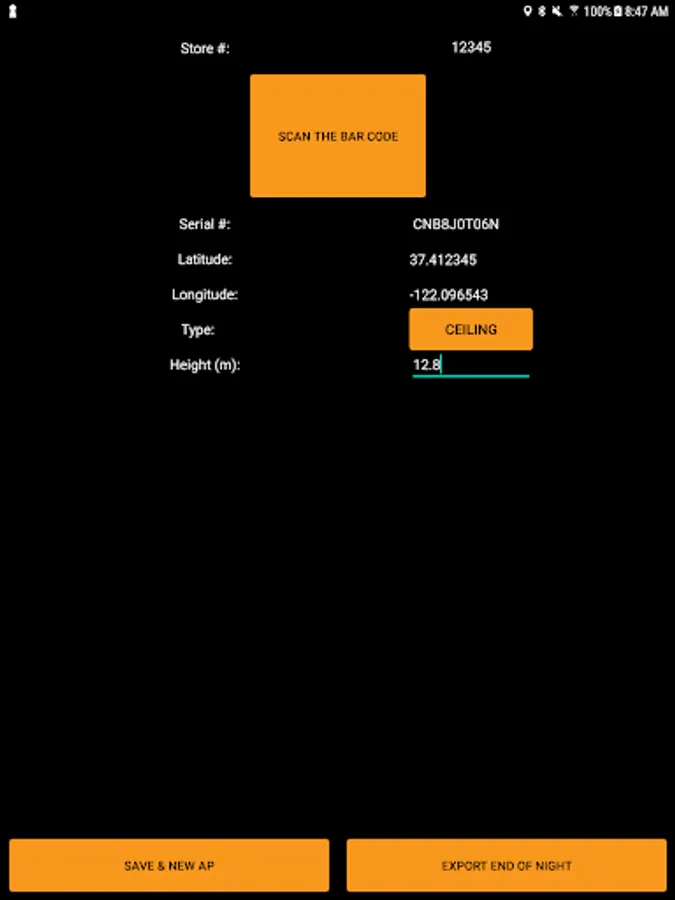 This app allows scanning of a barcode for serial number, captures the GPS location as latitude, longitude, altitude and adds information about the mounting type (ceiling or wall) and height above floor level. A file containing records of multiple access points can be emailed to a desired recipient.