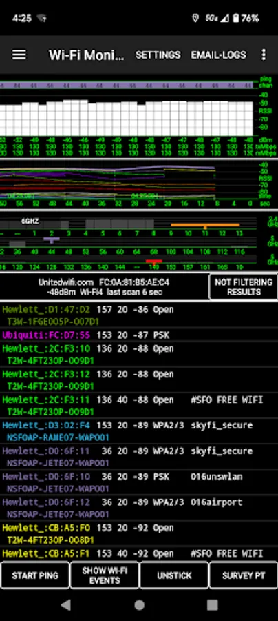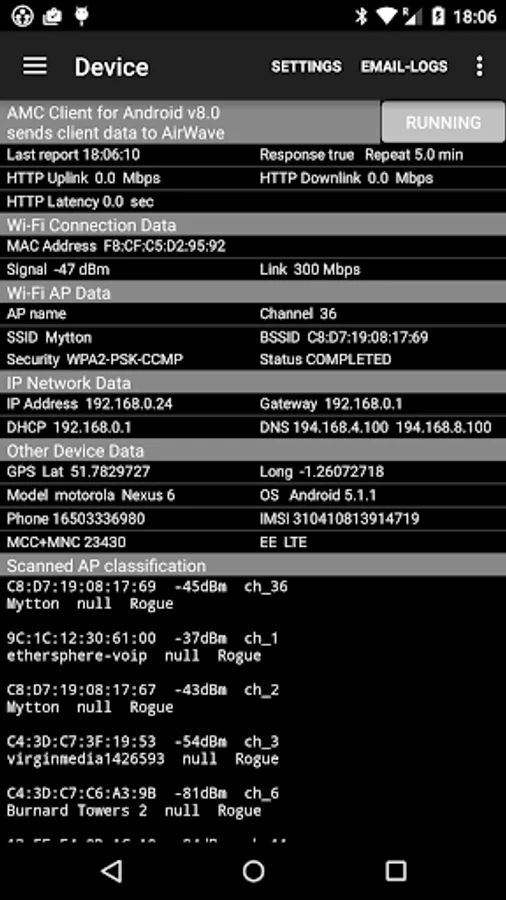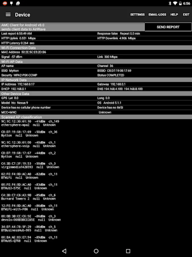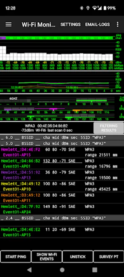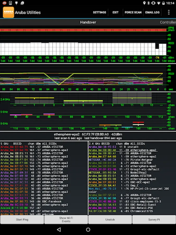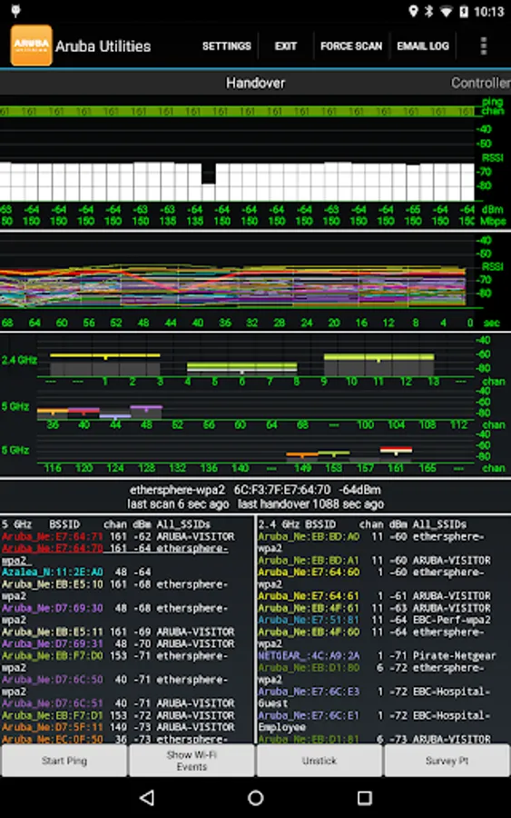 • A Wi-Fi Monitor showing the Wi-Fi environment, including the current access point, RF channels, RSSI measurements and up/down PHY rates, other access points audible to the device and handover events. AP names are displayed (when configured on the AP, of course).