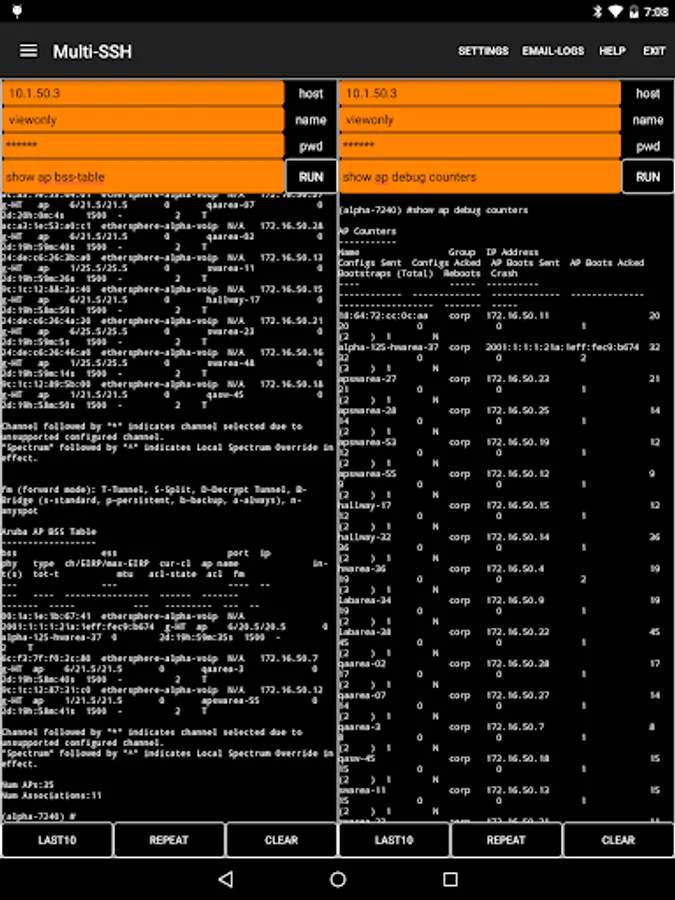 • The multi-SSH tab offers side-by-side telnet windows for managing multiple devices simultaneously: needs a big screen, most useful on a tablet.