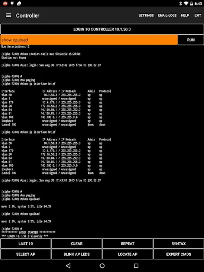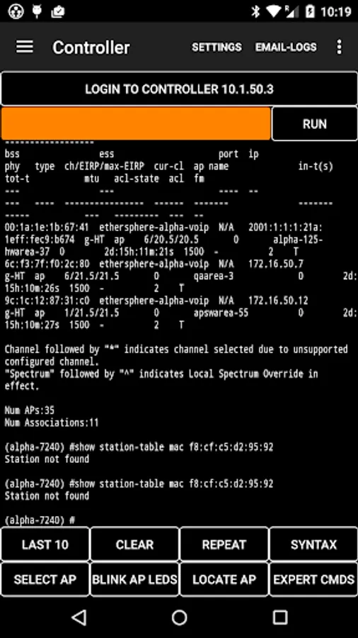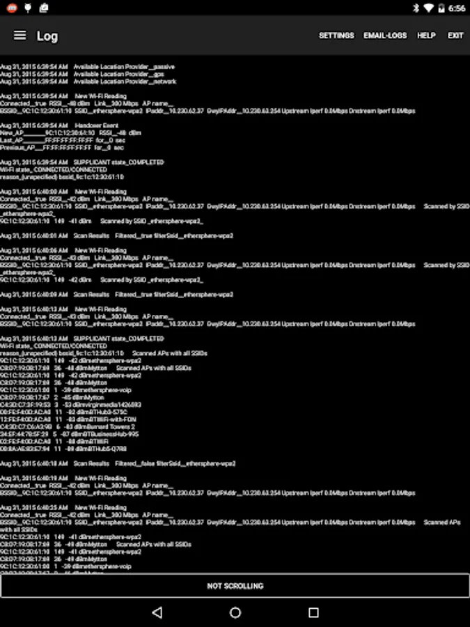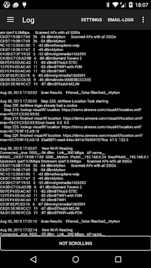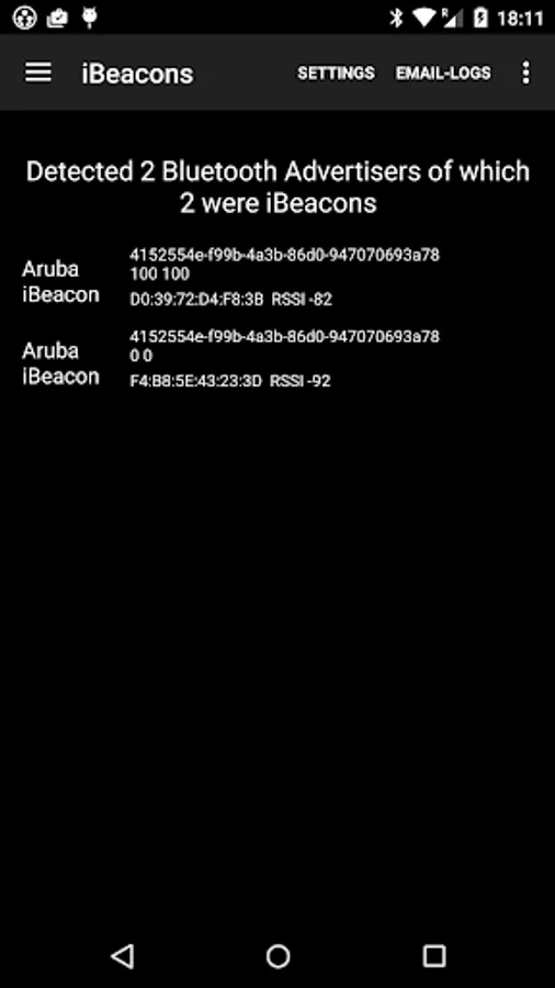 • A Bluetooth Low Energy (BLE) scan reports nearby iBeacons, Aruba beacons and other BLE devices with UUID, index values and signal strength measurements. Also the BluConsole function.
