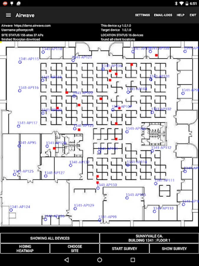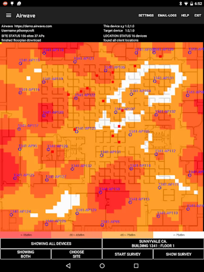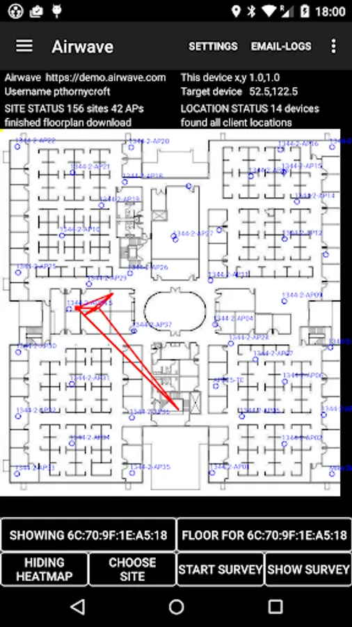 • An AirWave client that downloads the floorplan image and AP details from the network’s management system. See where APs are located relative to your position, and touch AP icons for details of current loading, channels and power. Also an estimated heatmap and a site survey function that links actual coverage measurements to locations on the floorplan.