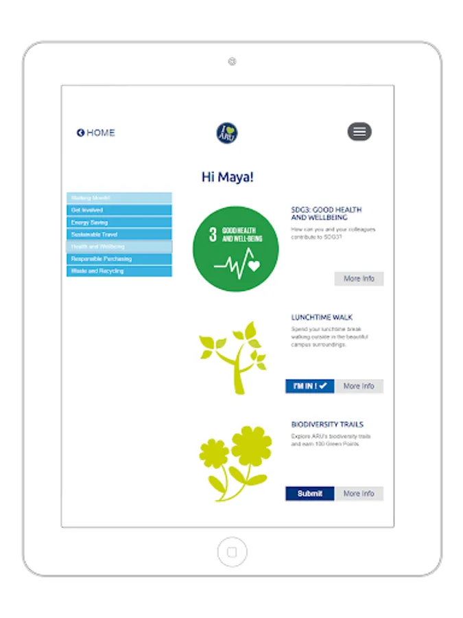 This app is the companion for the ARUgreen programme, designed to encourage staff to take positive actions that improve sustainability and wellbeing at the University.