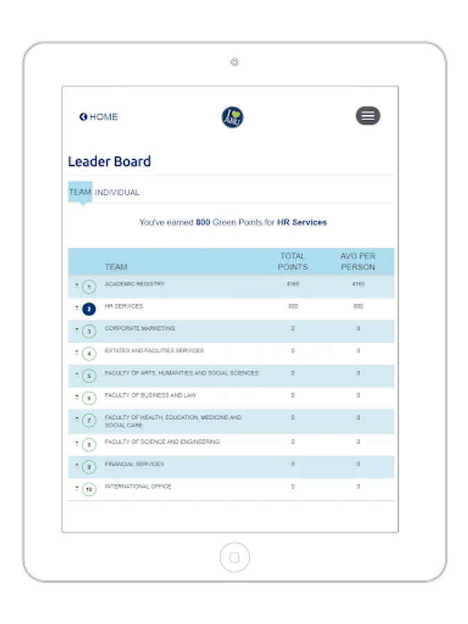 With this app you will be able to earn Green Points for your actions in themes including Get Involved, Energy Saving, Sustainable Travel, Health & Wellbeing, Responsible Purchasing and Waste & Recycling. You can make submissions, opt into activities and earn Green Points as well as view the leader boards and enter your weekly achievements.