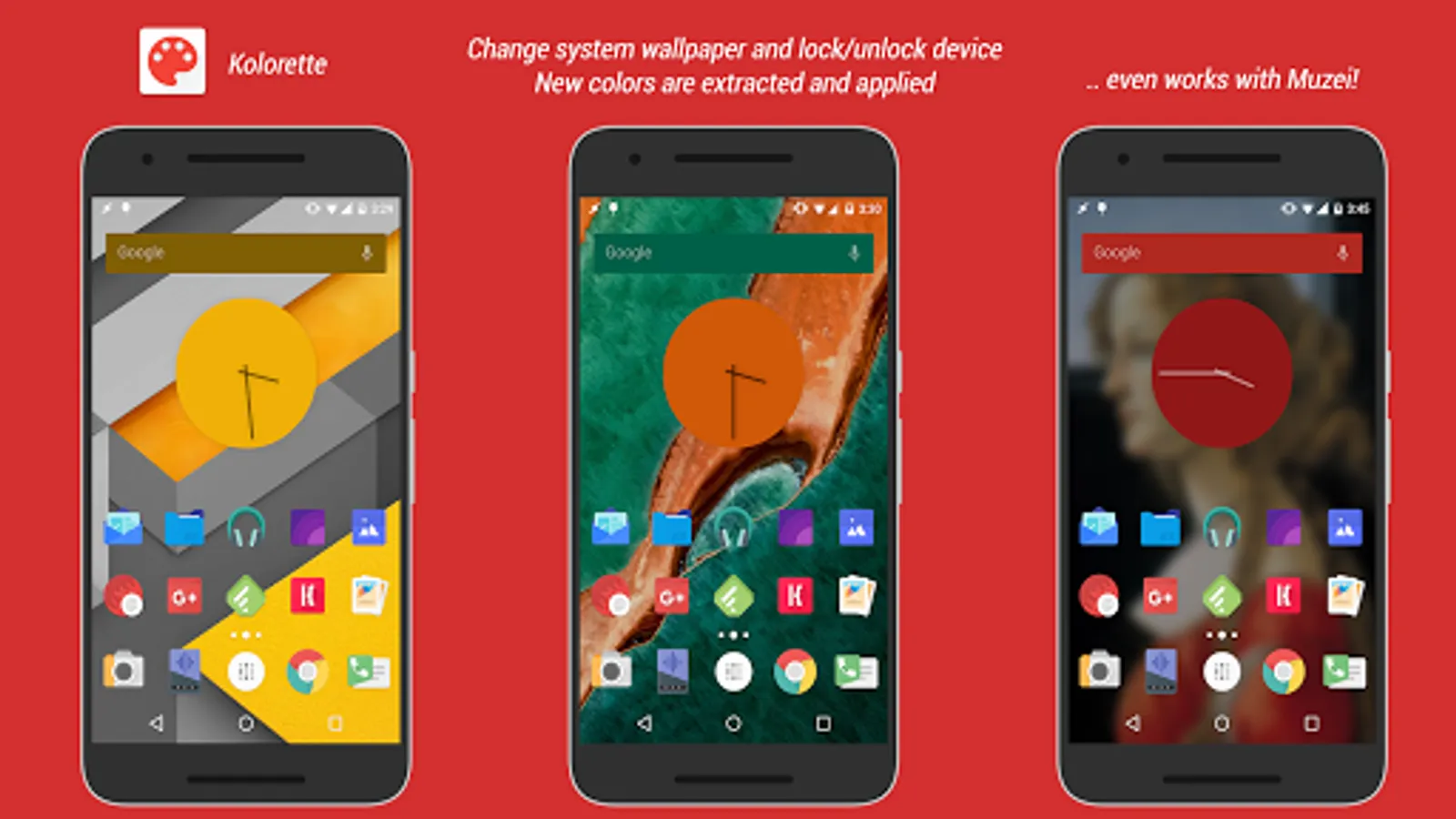 Kolorette widgets adapt to the system wallpaper by changing their color to prominent colors of the wallpaper. It uses Google's palette library to extract colors from wallpaper, Muzei artwork, any image on storage and music album art cover and then colors them. So you have great looking widgets that blend with the background.