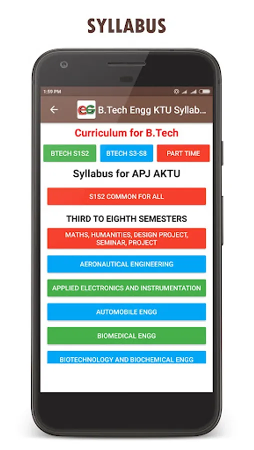 Syllabus – Syllabus of APJ AKTU & Calicut University can view & Download from this section. Modified KTU S1S2 Syllabus & S3-S8 KTU Syllabus also added in this App. Curriculum for KTU S1S2, S3-S8 and Part Time B.Tech. is also added.