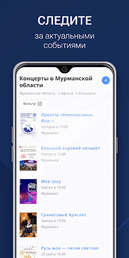 Poster: Plan your vacation with our application. Find out about all the events in your city and region: concerts, theaters, cinemas.