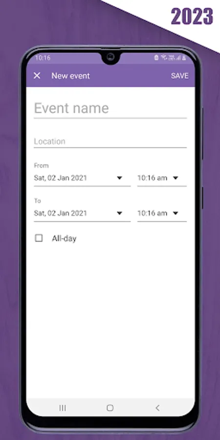 • Shows markers for dates with events.