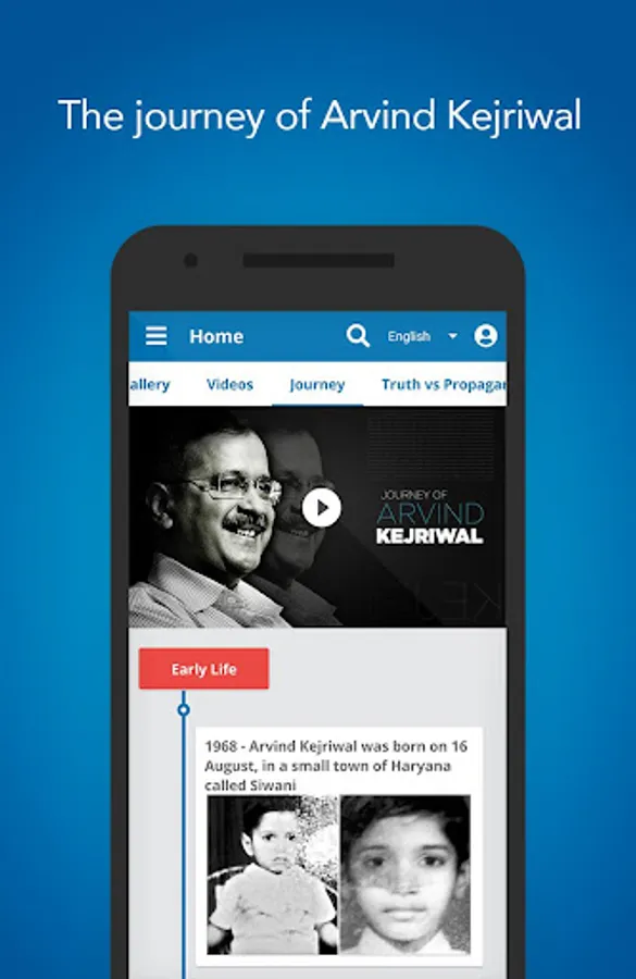 Journey: For the first time, trace Arvind Kejriwal’s entire journey, from his days as a student at IIT Kharagpur, to his struggle for the people as an activist, to his transition into politics. Access an interactive timeline that documents this journey through pictures and videos.