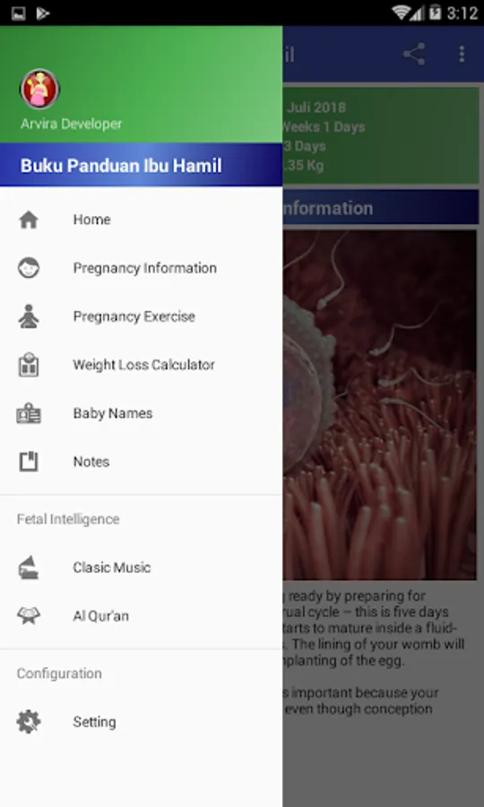 When the mother opens this Mother's Pregnancy Guidebook Application will automatically be given information about fetal development this week contains General Information of Pregnancy This Week, Mother's Condition This Week, Fetal Conditions This Week, and Did you know that contains tips during pregnancy.