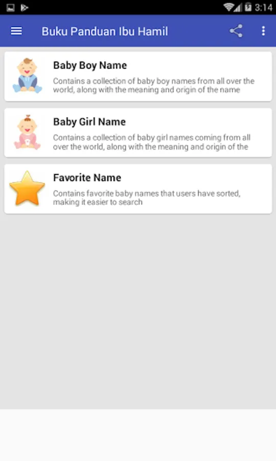 Mother need not worry anymore by downloading other apps to find the recommendation of good names for our baby candidate. In the Application of Pregnancy Guidebook there is also a collection of baby names from around the world along with the meaning, and a collection of series of Muslim baby names.