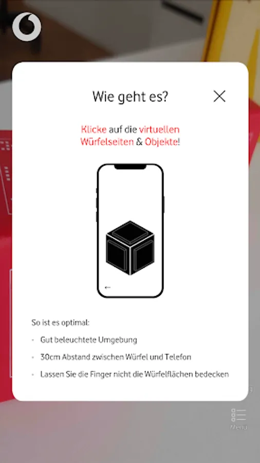 "Expand your reality: Experience regularly changing infotainment on current Vodafone topics through augmented reality and play exciting games - all interactive, in a completely new form. Transform the cube into a Vodafone cinema, a holocube, for example, or display 3D animations .