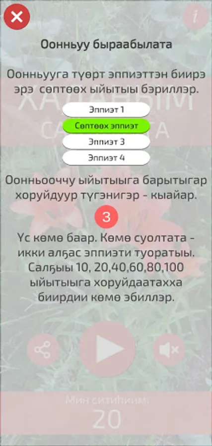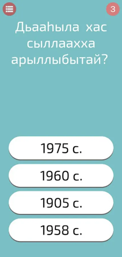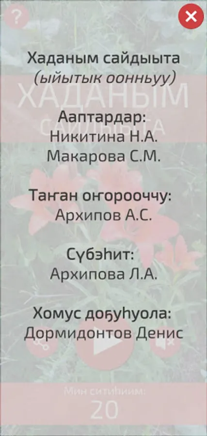 Educational game - quiz "Hadanym saidyta" ("Development of Hadan"). The first version contains 116 questions regarding the history of the development of the Khadan nasleg. The game is aimed at school students, residents of the Nasleg to learn the history of their native Nasleg. This game, as a teaching material, can be used in history lessons, social studies, museum lessons, class hours.