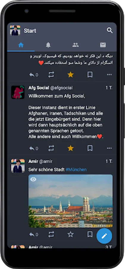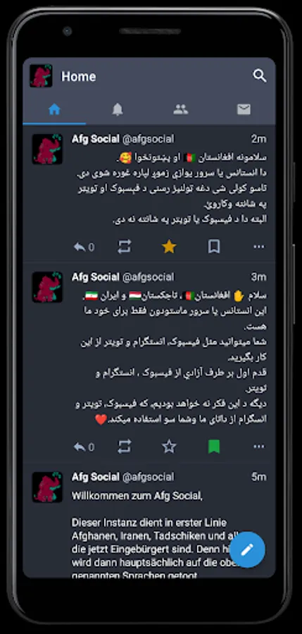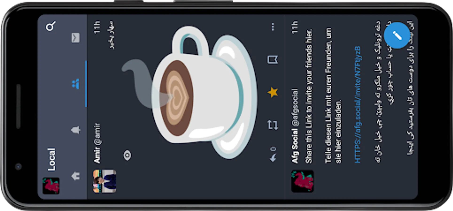 Afg is a lightweight client for Mastodon, a free and open-source social network server. It supports all Mastodon features, like photos, videos, lists, custom emojis and is designed according to material guidelines. You can choose between a dark, a light and a black theme in Afg social. It has notifications and a drafts feature.